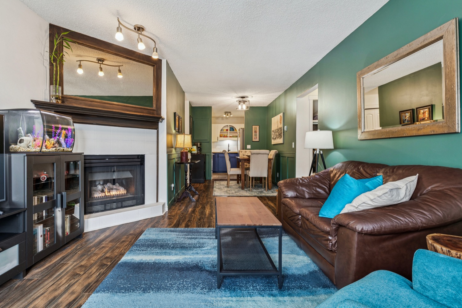 Bathed in natural light from its sunny south exposure, this inviting unit immediately feels like home. The open-concept living room flows seamlessly into the kitchen and dining nook, creating a bright, spacious setting ideal for relaxing or entertaining. At the heart of the living area, a cozy gas fireplace invites you to curl up with a good book and enjoy the warmth and sunshine year-round. The thoughtfully designed kitchen features functional cabinetry enhanced with stylish finishing details, including decorative open shelving, a pullout drawer inside the lower cabinet, and appliances updated in recent years.