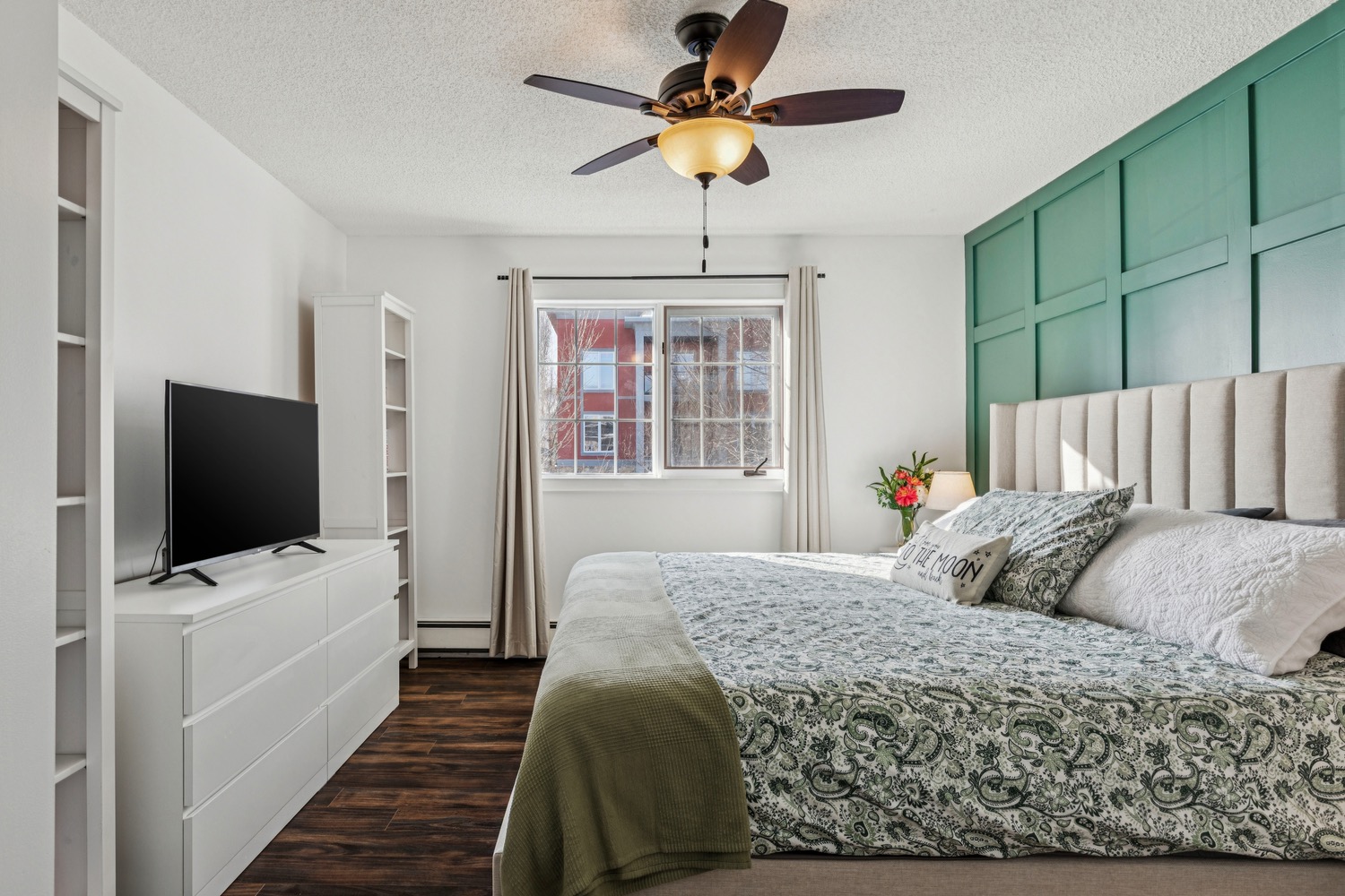 Two generously sized bedrooms provide excellent flexibility. The primary suite is filled with sunshine and easily accommodates a king-sized bed with plenty of additional furniture space. It includes a walk-in closet and a beautifully refreshed 3-piece ensuite with an updated shower. The second bedroom, currently styled as a den, offers fantastic closet built-ins and ample space for your use. Additional storage is conveniently located in the common basement, perfect for seasonal items and outdoor gear.
