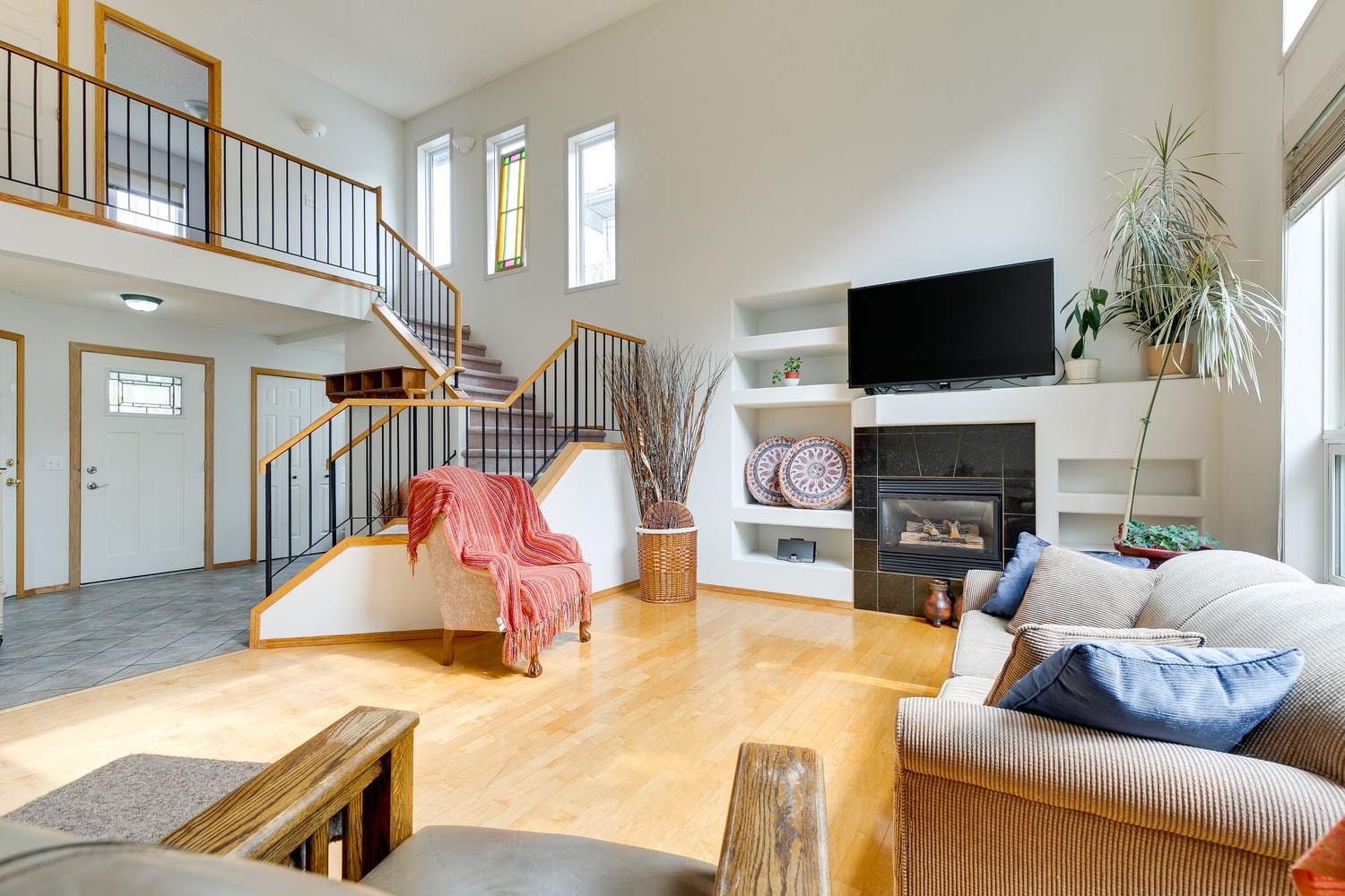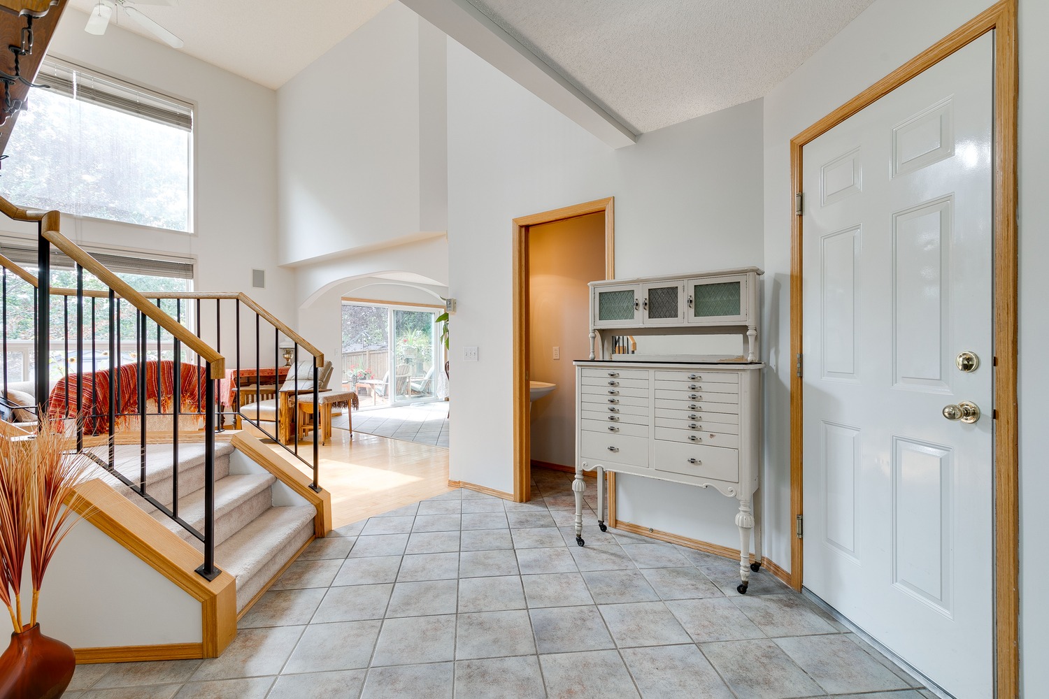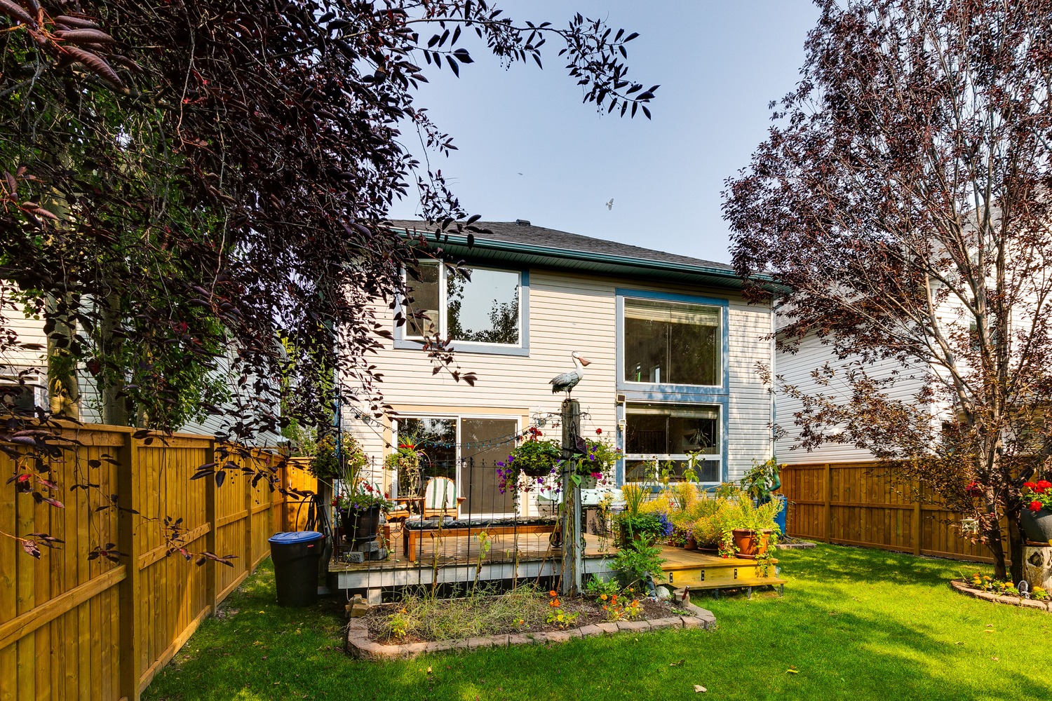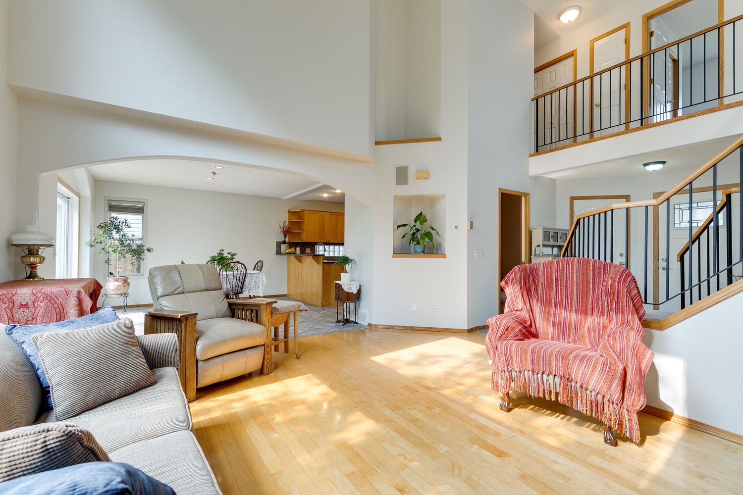 This sought-after neighbourhood offers direct access to the Valley Ridge Golf Course, Bow River pathways, and over 50% preserved green space—ideal for hiking, biking, and exploring the outdoors. Families will value the proximity to reputable schools, while the active community association fosters connection through events and programs. With quick access to Highway 1 and Stoney Trail, commuting downtown or across the city is effortless. This beautifully maintained home blends classic charm with modern comfort. The main level features a spacious foyer leading into a sun-filled living room with soaring 20-foot ceilings. An open floor plan flows into the dining area and generous kitchen, all overlooking the backyard. Upstairs, the primary suite includes a walk-in closet and 4-piece ensuite. Two additional bedrooms share a Jack & Jill bathroom, and laundry is conveniently located on the upper level. The finished basement offers a large family room, fourth bedroom, full bathroom, and ample storage. Outside, mature trees, a wood deck, and a garden shed create a private backyard retreat—perfect for relaxing or entertaining.