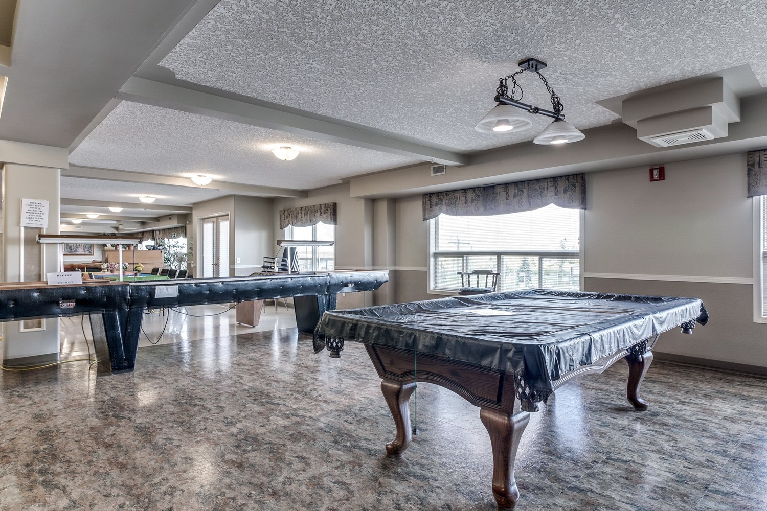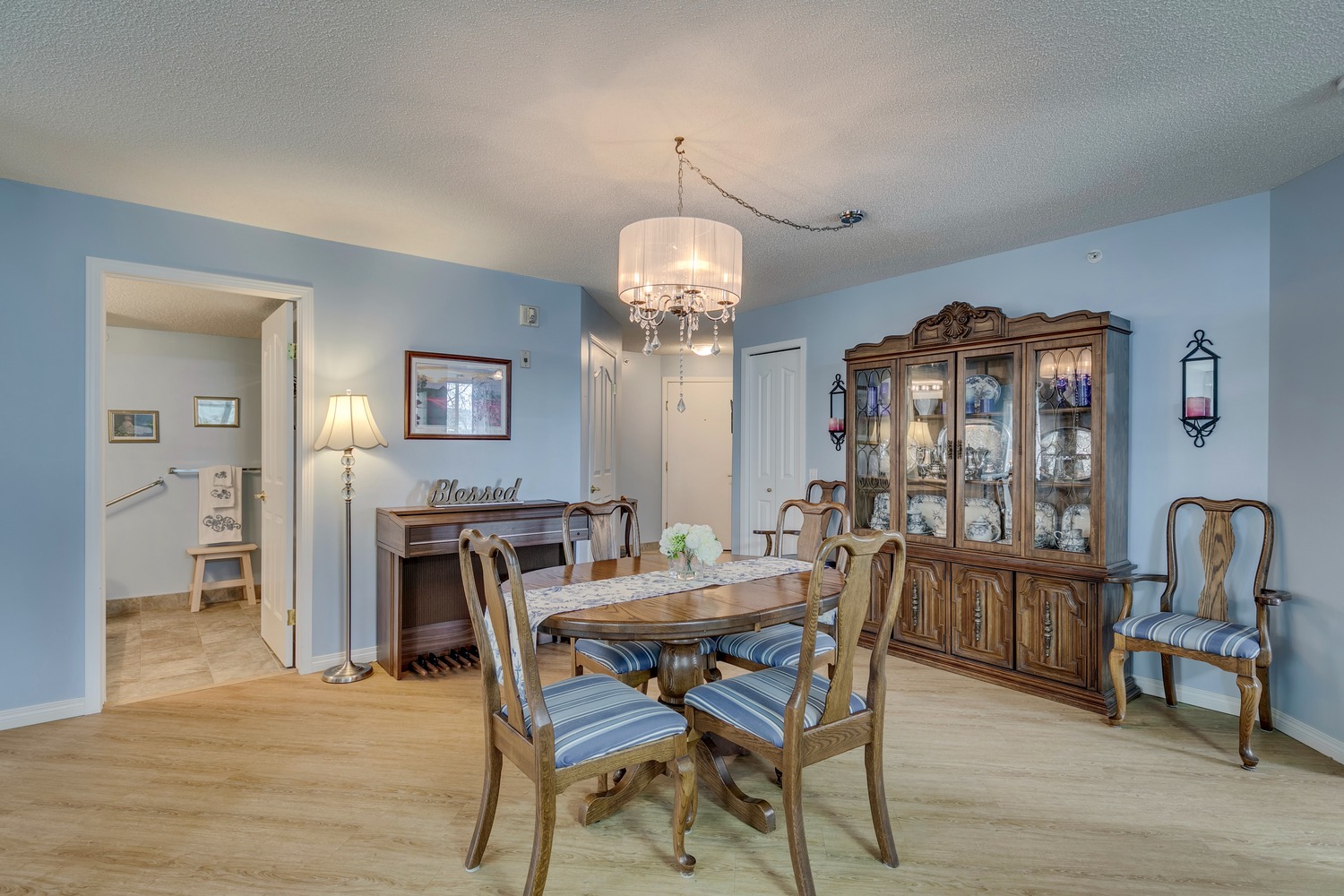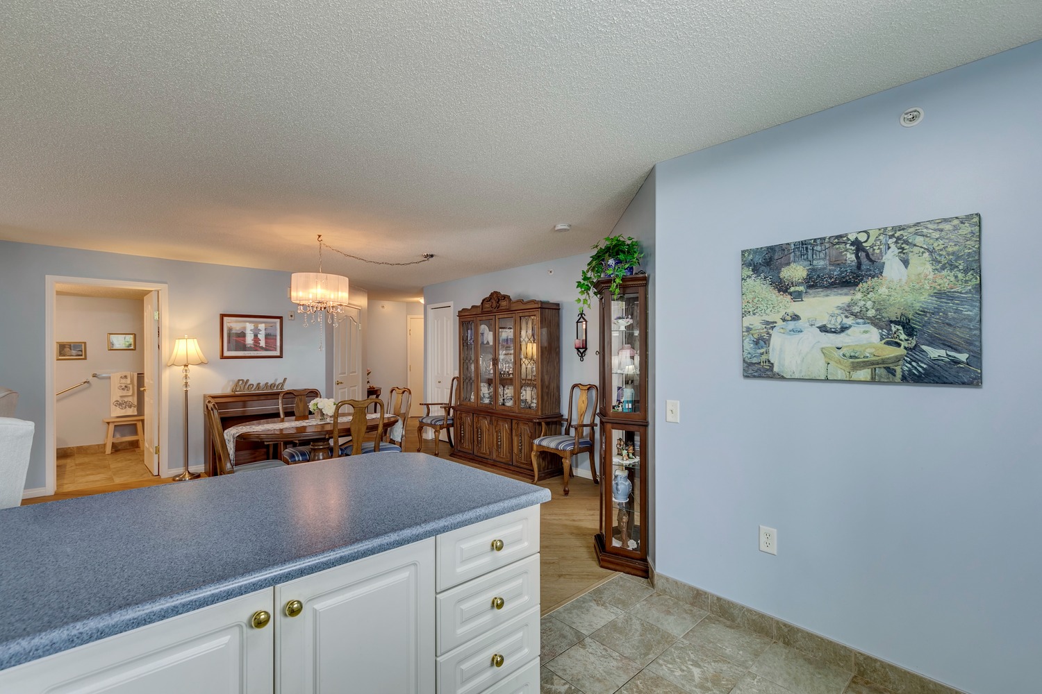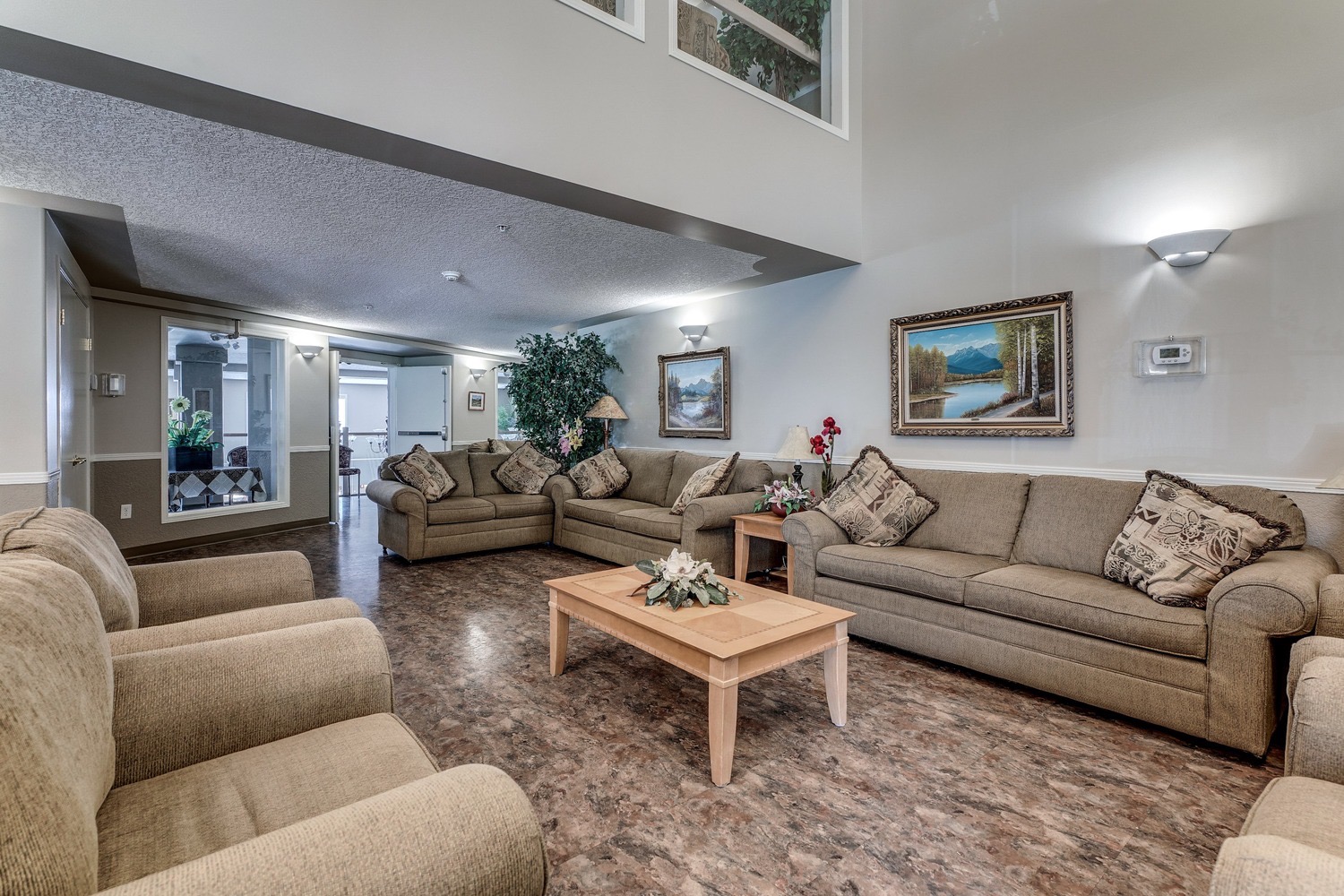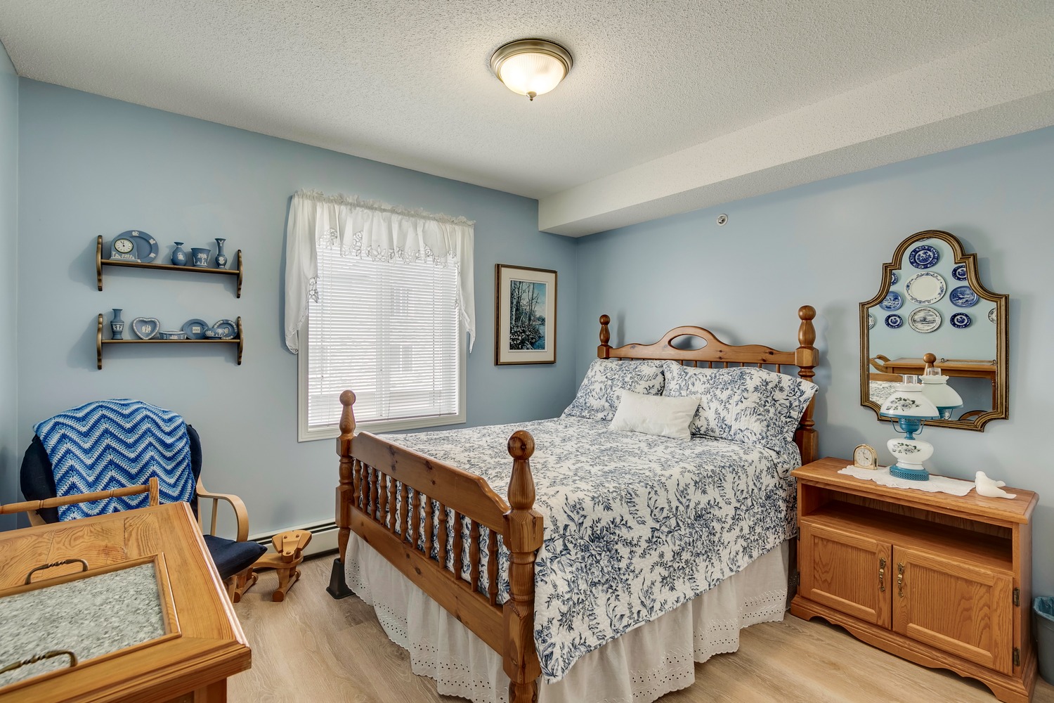 A quiet corner unit in the fabulous complex of Legacy Estates in Millrise with window A/C and no unit above. This 60+ building offers an exceptional life-style. A rare 1000+ sq ft 2 bedroom 2 bath unit is bright and roomy with multiple windows allowing an abundance of natural light. The in-suite laundry has stacked front loading washer/dryer (washer is brand new) and excellent storage. There is an additional titled storage unit and a titled parking stall in a heated, secure parkade, with a shared car wash bay.The bright, spacious kitchen is equipped with high end appliances including: GE cook top stove with convection oven, Whirpool microwave, Kitchen Aid dishwasher and Maytag fridge with ice maker and filtered water dispenser. You’ll appreciate plenty of counter and cupboard space. The tree lined shaded balcony is accessed through the gracious livingroom and faces a quiet parking lot and driveway. New luxury vinyl with premium underlay in both bedrooms has been recently installed. Flooring is all vinyl plank and tile, with no carpet. Lighting has been updated in kitchen and dining room, as has the main bath sink faucet and hand held shower head in ensuite. Building amenities abound including: library, fitness room, dining room, social room, rooftop patio, card clubs, coffee club, knitting and craft clubs, pool table and shuffle board in games room, regular social events and entertainment, a guest suite that can be rented when company comes, wheelchair accessibility, on site hairdresser. Pet approval required. Condo fees include everything except cable and phone. There is a mandatory meal plan of $75 a month for delicious and varied chef cooked meals available 5 nights a week.The chef will also cater the dining hall for special events and family celebrations. No need to go on a cruise you live in luxury in this building!