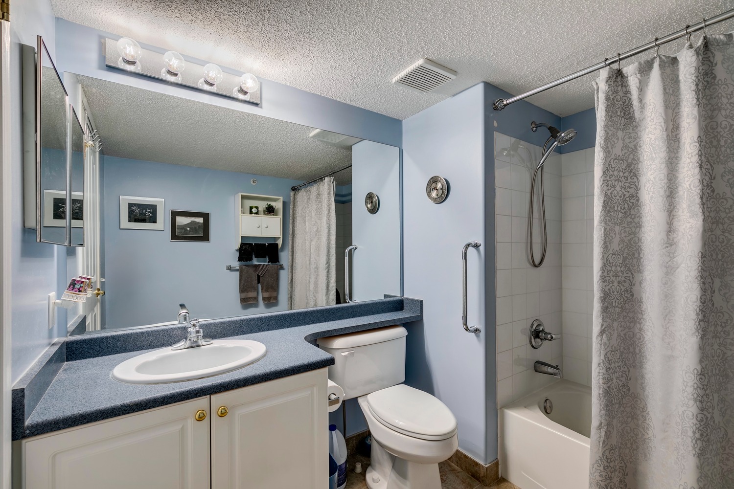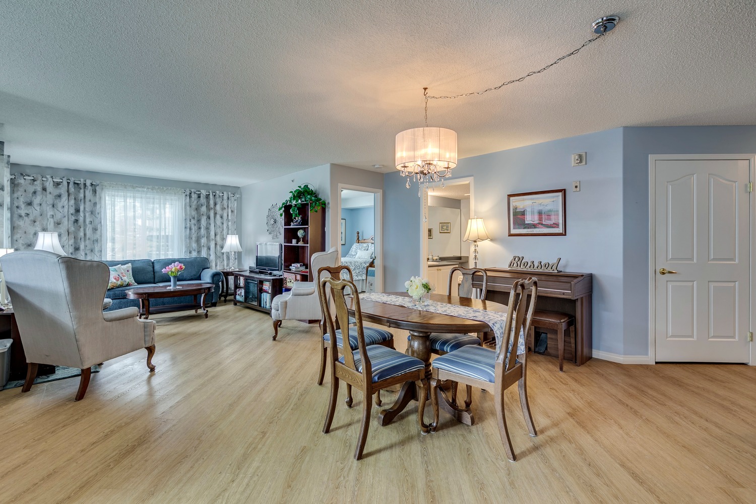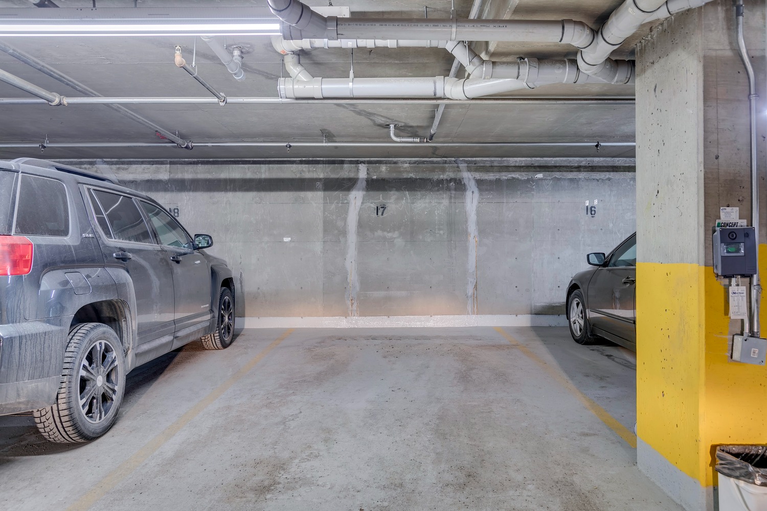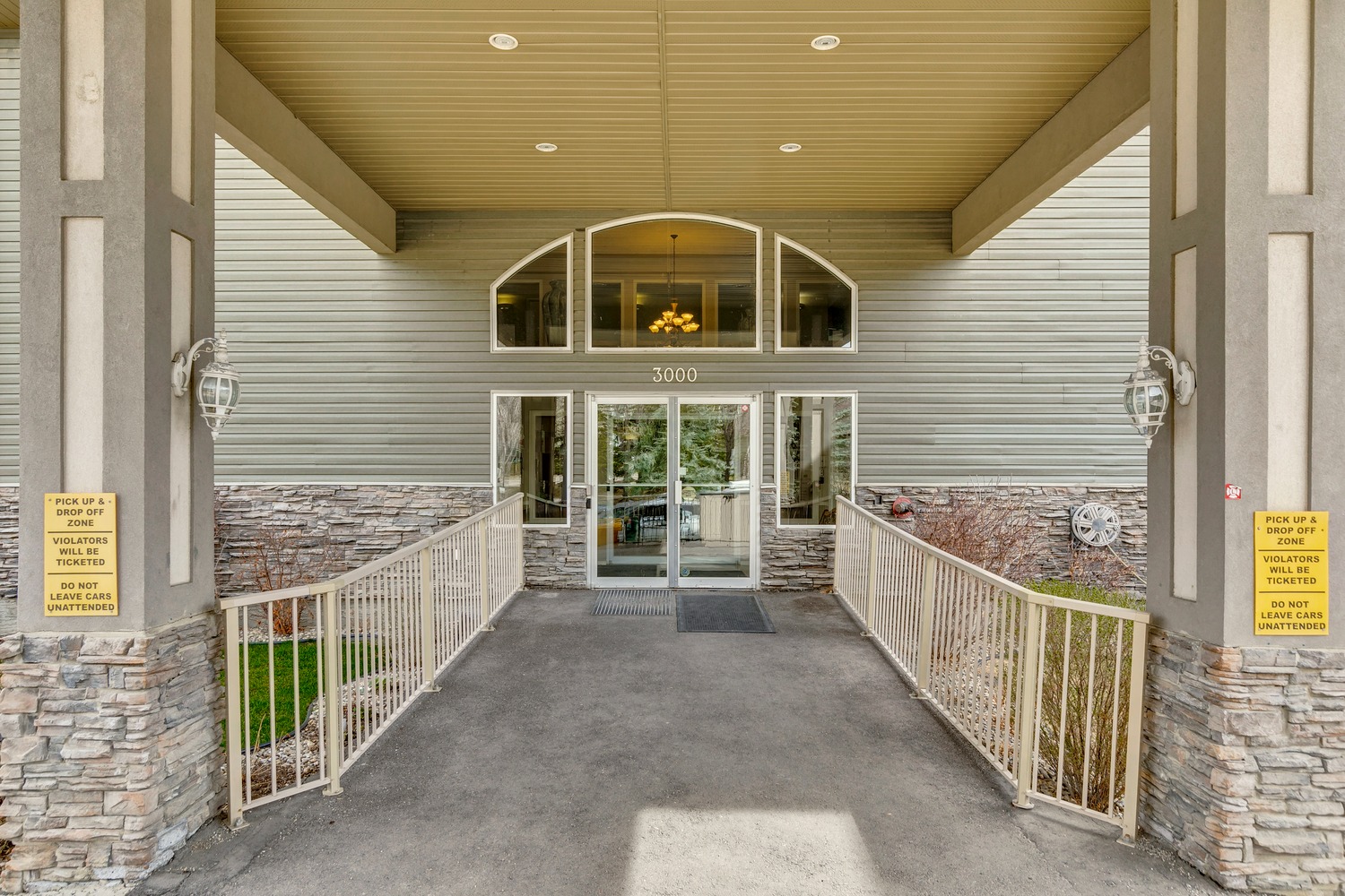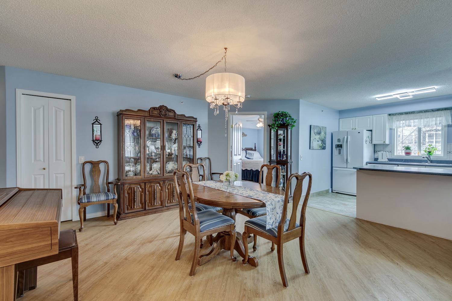 A quiet corner unit in the fabulous complex of Legacy Estates in Millrise with window A/C and no unit above. This 60+ building offers an exceptional life-style. A rare 1000+ sq ft 2 bedroom 2 bath unit is bright and roomy with multiple windows allowing an abundance of natural light. The in-suite laundry has stacked front loading washer/dryer (washer is brand new) and excellent storage. There is an additional titled storage unit and a titled parking stall in a heated, secure parkade, with a shared car wash bay.The bright, spacious kitchen is equipped with high end appliances including: GE cook top stove with convection oven, Whirpool microwave, Kitchen Aid dishwasher and Maytag fridge with ice maker and filtered water dispenser. You’ll appreciate plenty of counter and cupboard space. The tree lined shaded balcony is accessed through the gracious livingroom and faces a quiet parking lot and driveway. New luxury vinyl with premium underlay in both bedrooms has been recently installed. Flooring is all vinyl plank and tile, with no carpet. Lighting has been updated in kitchen and dining room, as has the main bath sink faucet and hand held shower head in ensuite. Building amenities abound including: library, fitness room, dining room, social room, rooftop patio, card clubs, coffee club, knitting and craft clubs, pool table and shuffle board in games room, regular social events and entertainment, a guest suite that can be rented when company comes, wheelchair accessibility, on site hairdresser. Pet approval required. Condo fees include everything except cable and phone. There is a mandatory meal plan of $75 a month for delicious and varied chef cooked meals available 5 nights a week.The chef will also cater the dining hall for special events and family celebrations. No need to go on a cruise you live in luxury in this building!